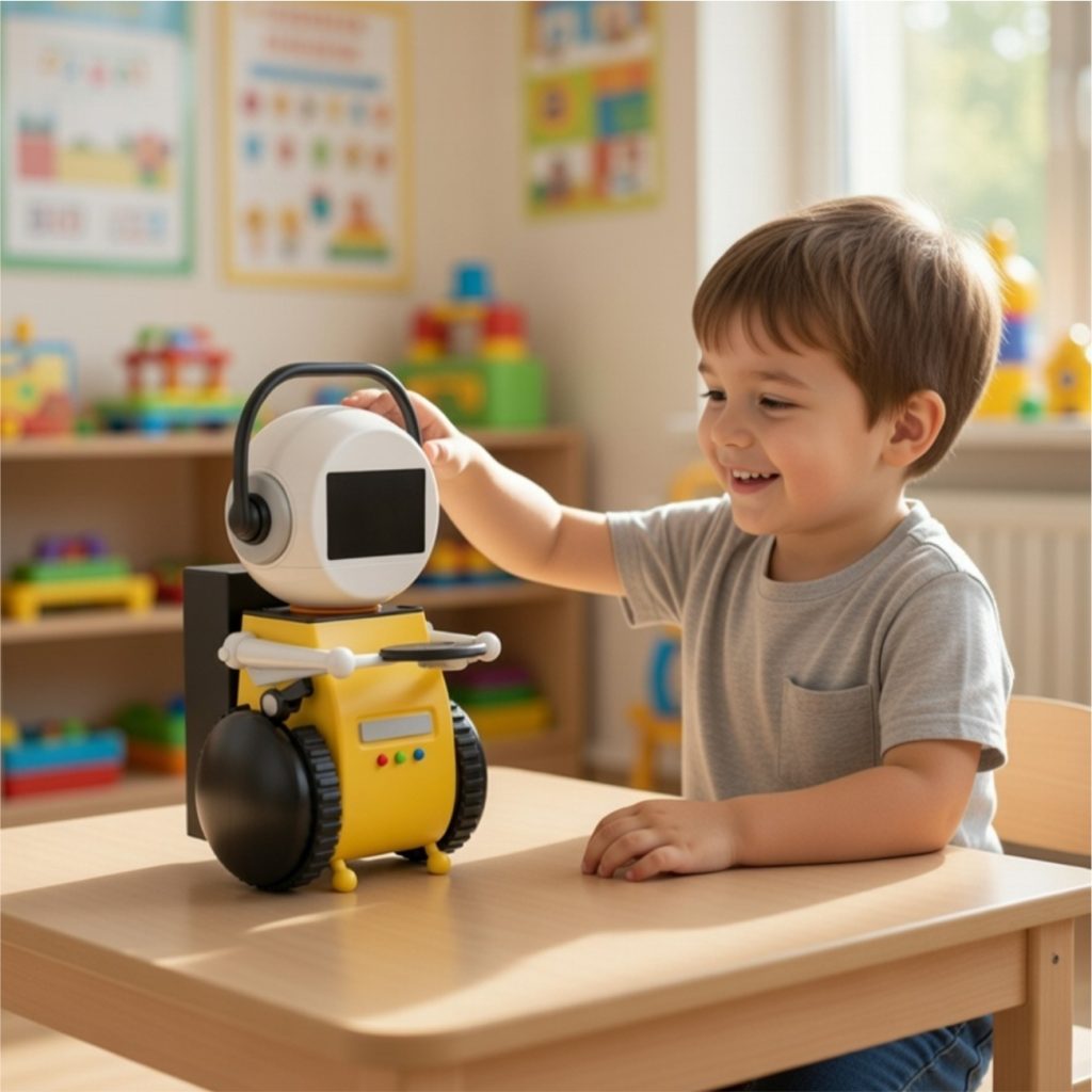 Compact handheld robot for children (approx. 15–20 cm height)